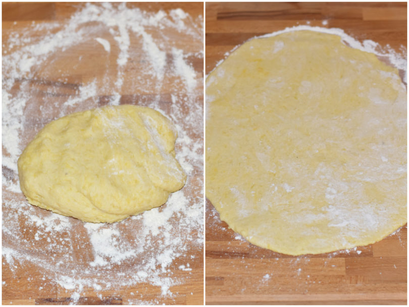 Nel frattempo stendete l'impasto con il matterello sul piano di lavoro infarinato fino allo spessore di 1 cm e ricavate dei cerchi da circa 8 cm con un coppapasta.