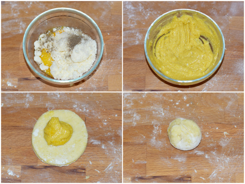 Mettete un pochino di ripieno al centro di ogni disco e richiudete l'impasto su di esso creando una pallina.