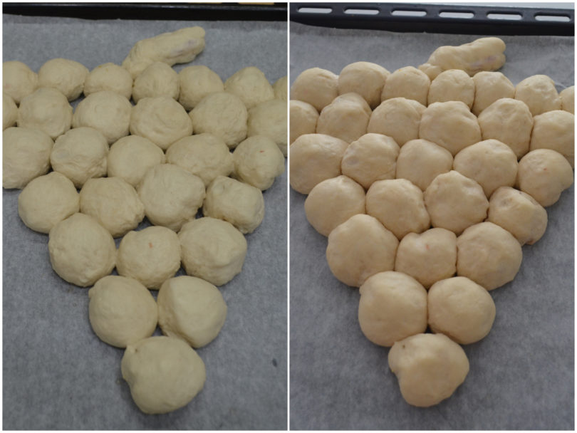 Cuocete il grappolo di pane, in forno ventilato preriscaldato a 180° C, per 35-40 minuti, quidni fatelo almeno intiepidire prima di servirlo.