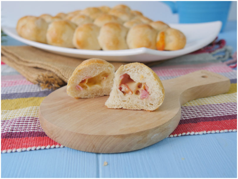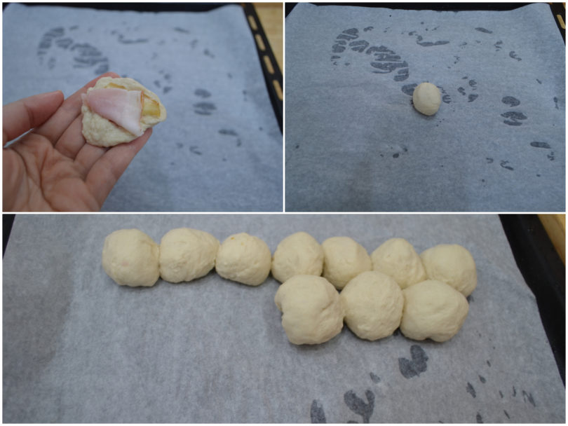 Mettete al centro di ogni dischetto un po' di prosciutto e formaggio, quindi richiudete l'impasto intorno al ripieno creando una pallina.