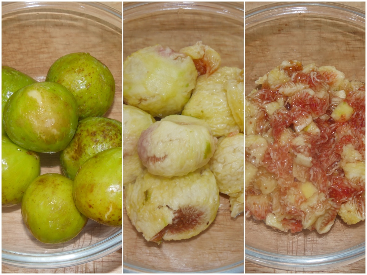 Innanzitutto lavate tutti i fichi e sbucciatene solo i 2/3, tritandoli poi grossolanamente (o potete anche schiacciarli con una forchetta).