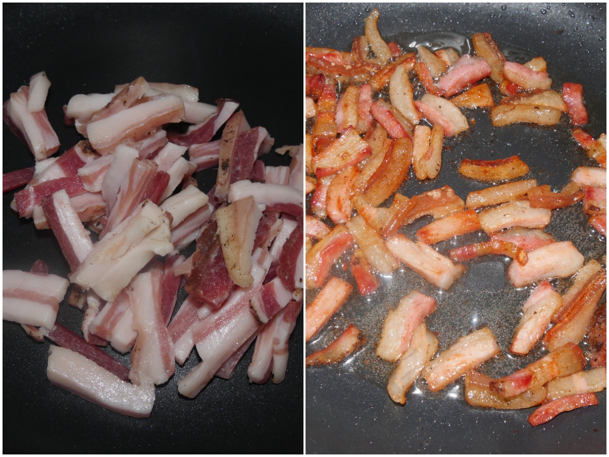 Tagliate il guanciale a listarelle e fatelo rosolare a fiamma bassa finché non sarà ben croccantino (circa 10 minuti), girandolo spesso.