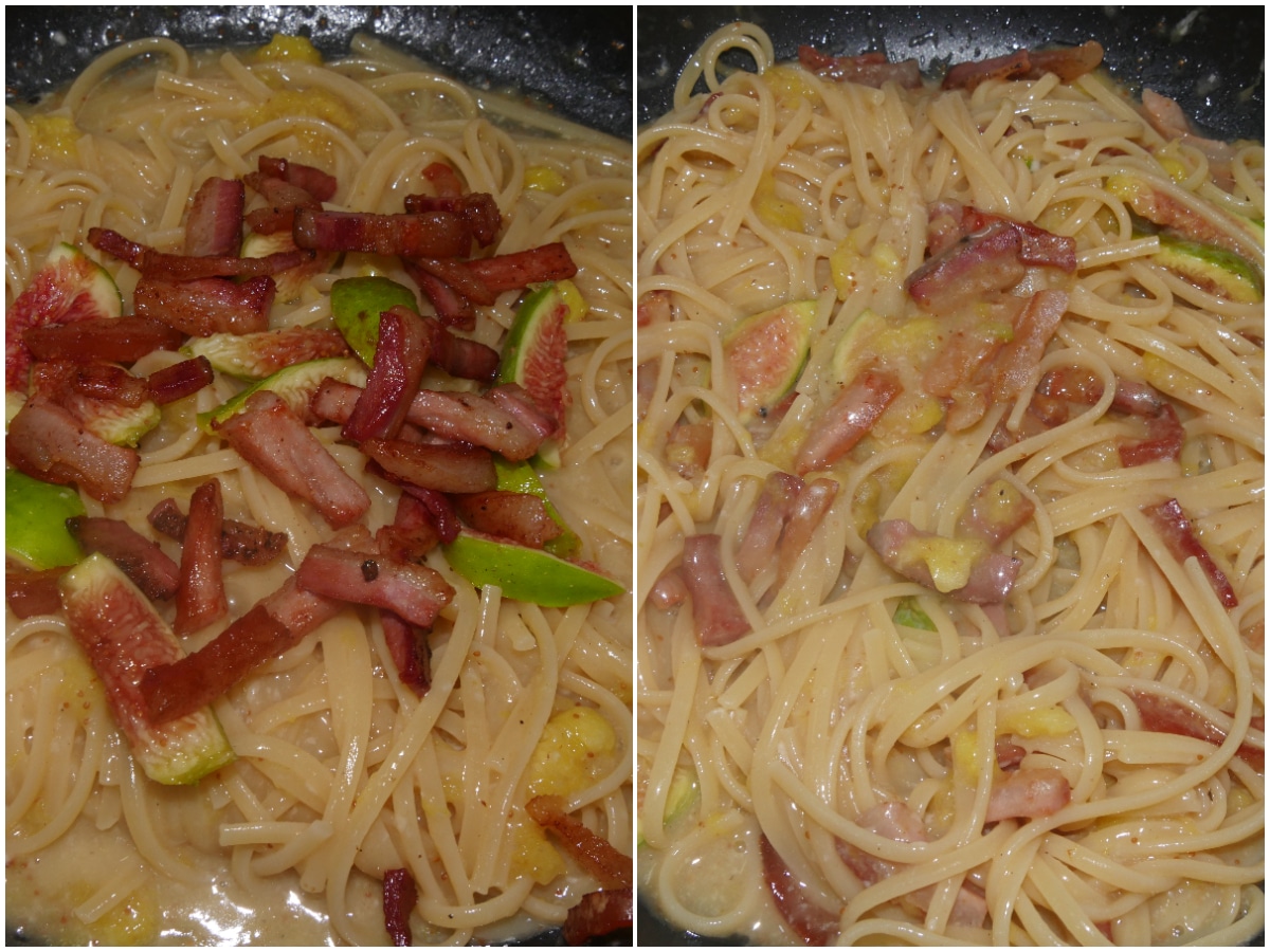 Tirate via il guanciale e aggiungete i fichi tritati, fateli insaporire velocemente, quindi aggiungete la pasta e mantecate con il pecorino (e un po' di acqua di cottura, se serve).