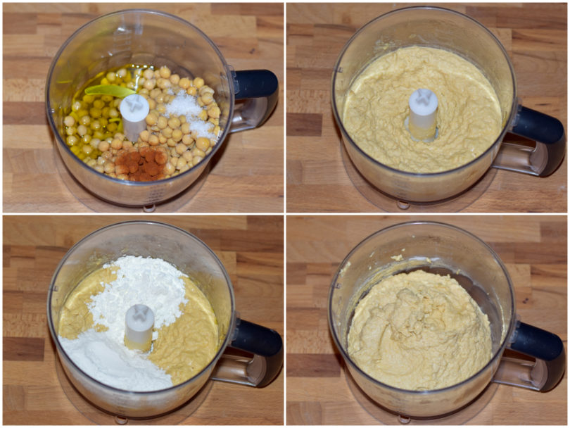 Mettete in un mixer ceci ben scolati,, olio, sale, paprica e frullate, quindi unite anche le farine e mescolate bene.