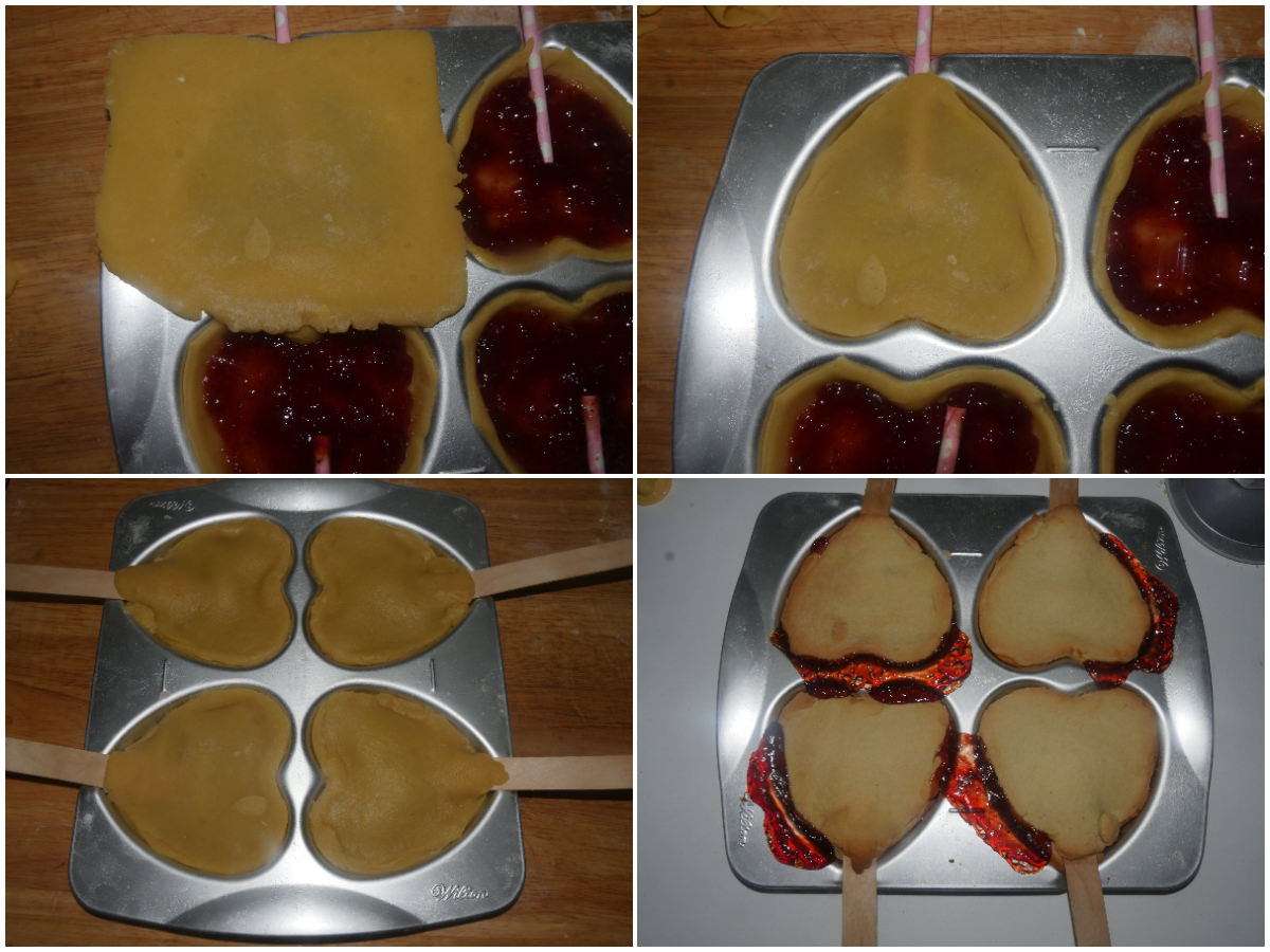 Sistemate lo stecco da gelato (io inizialmente ne avevo usato uno da cake pops, ma era troppo sottile per reggere il peso delle crostatine) e riempite di marmellata (non esagerate, o vi uscirà in cottura, com'è successo a me).