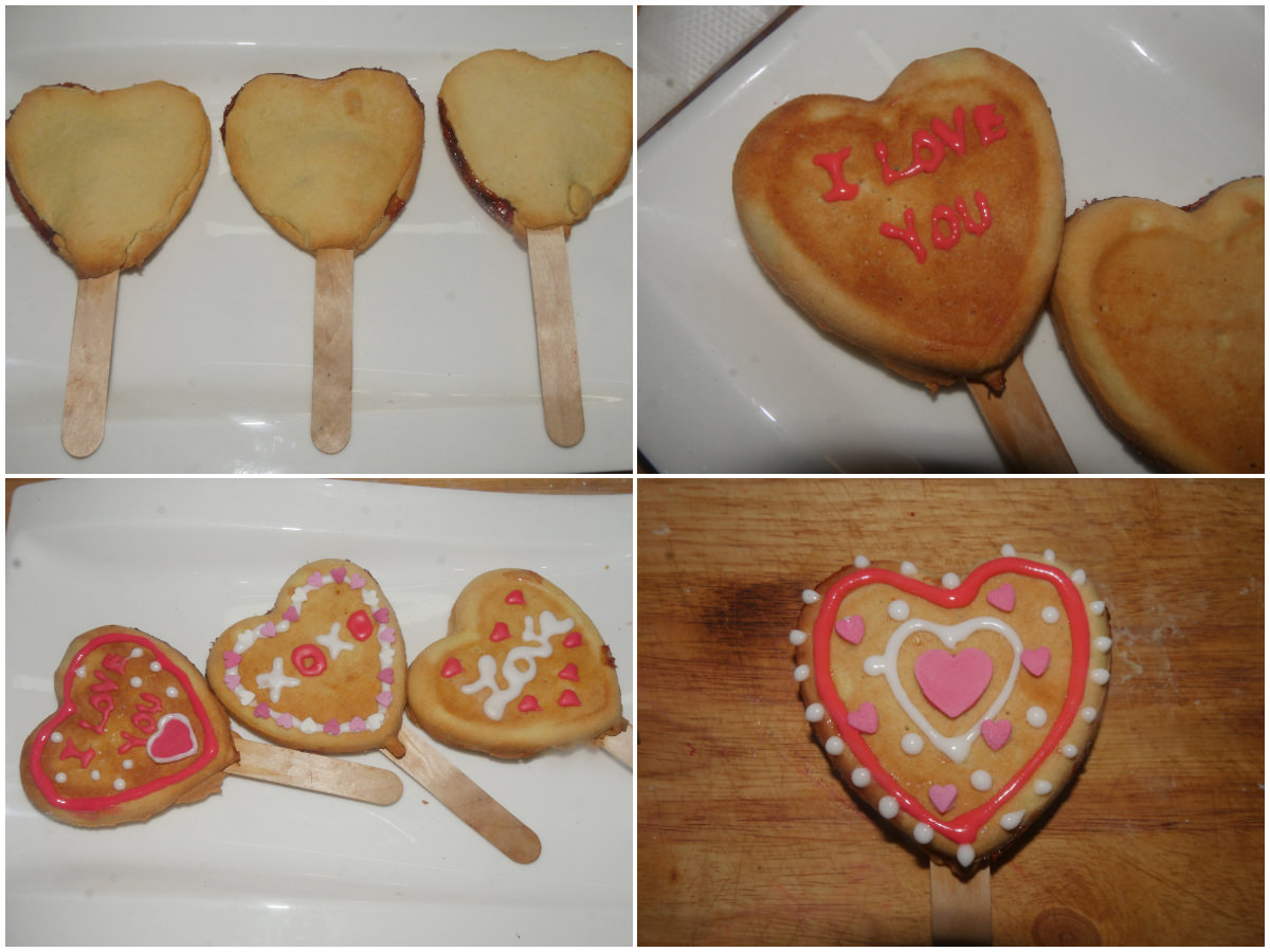 Procedete con la decorazione, con la ghiaccia ed eventualmente zuccherini a forma di cuore e poi fate asciugare.