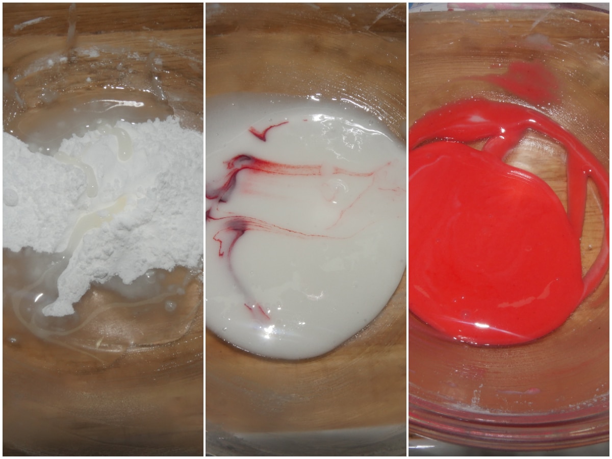 Preparate la ghiaccia reale, semplicemente mescolando insieme zucchero e albume e poi unendo colorante a piacere (io ho diviso la ghiaccia in 2 ciotoline e ne ho colorata solo la metà).
