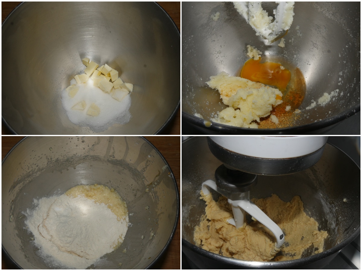 Innanzitutto preparate la pasta frolla: lavorate il burro con lo zucchero, quindi incorporate prima le uova (in foto ne vedete 2 perché inizialmente avevo fatto doppia dose di pasta frolla), poi anche la farina.