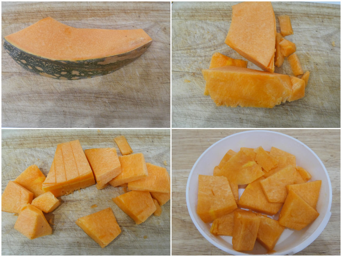 Innanzitutto mondate la zucca, tagliatela a pezzetti o fettine e cuocetela per 10 minuti in microonde (o bollitela per 20 minuti).