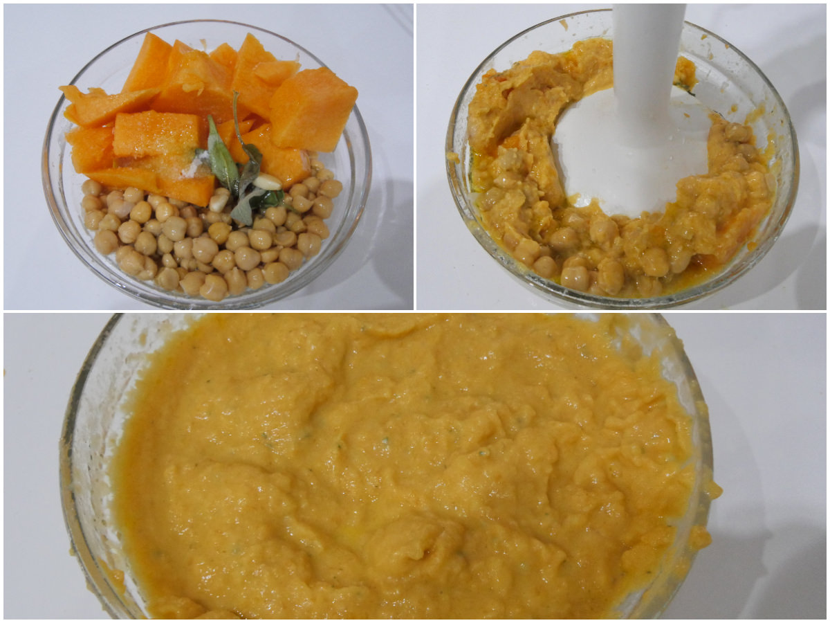 Mettete tutti gli ingredienti (zucca, ceci, tahina, aglio, succo di limone, rosmarino, salvia, sale e olio) in una ciotola e frullate fino ad ottenete un composto uniforme.