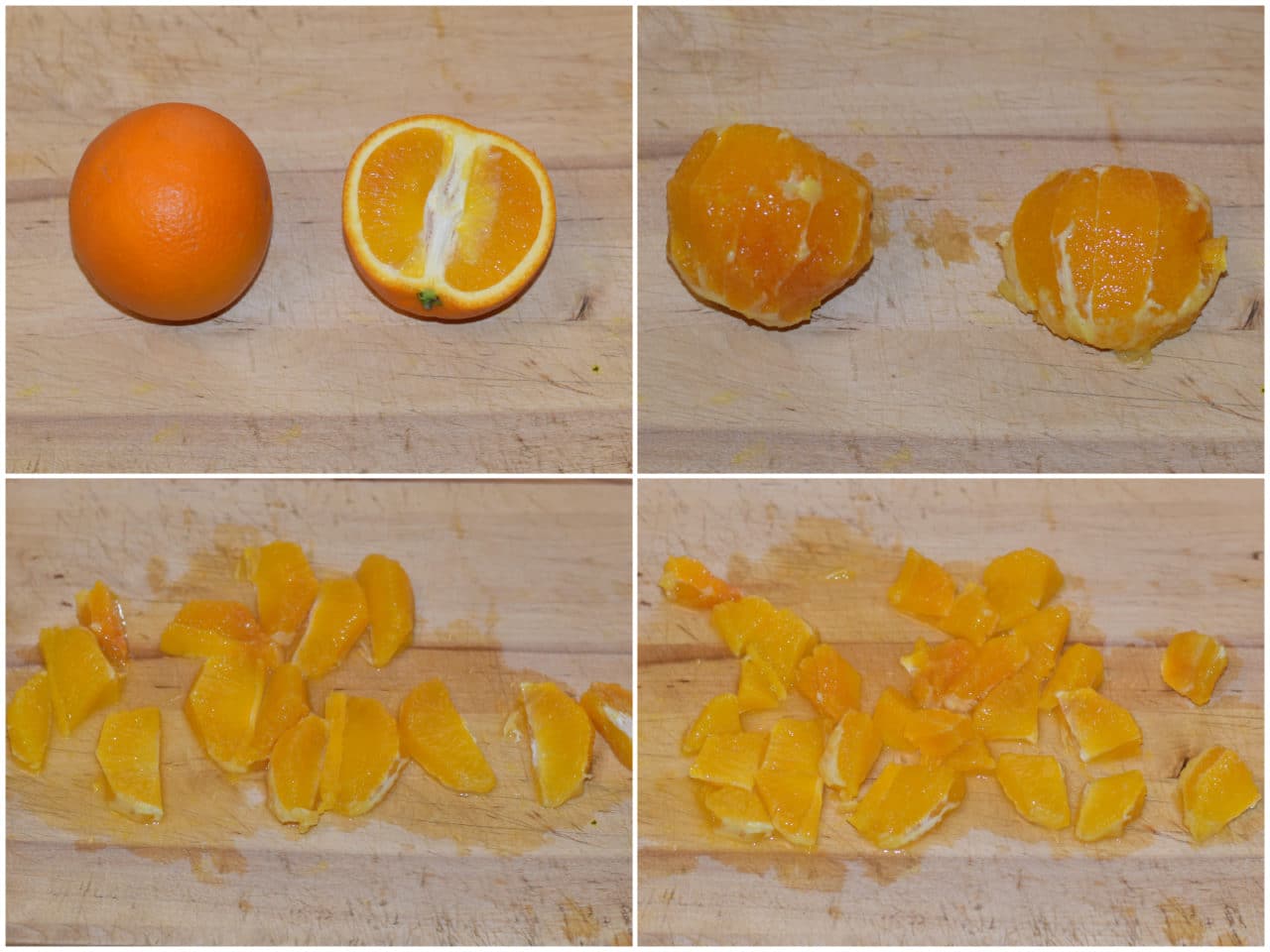 Innanzitutto pelate a vivo l'arancia e tagliatela prima a spicchi e poi dividete gli spicchi in 2-3 pezzi.