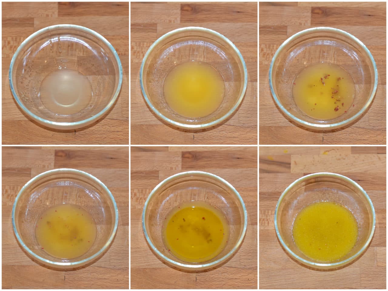 Preparate il condimento con succo di lime e arancia, sale e pepe rosa, mescolando per far sciogliere il sale, poi aggiungete anche l'olio ed emulsionate.