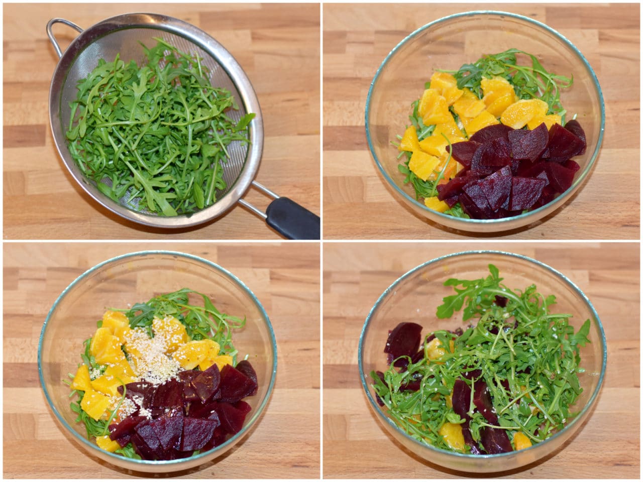 Sciacquate la rucola, scolatela bene e unitela in una ciotola con arancia, barbabietola e semi di sesamo, mescolando, poi condite con l'emulsione.