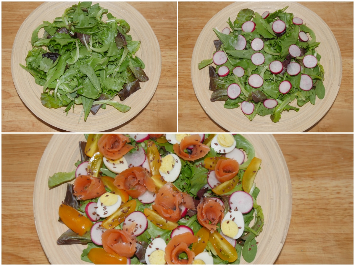 Assemblate la vostra insalata: disponete il lattughino ben lavato sul fondo del piatto da portata, quindi aggiungete ravanelli, pomodorini, salmone tagliato a striscioline e arrotolato per creare delle roselline (o potete semplicemente farlo a straccetti), uova e semi di lino.