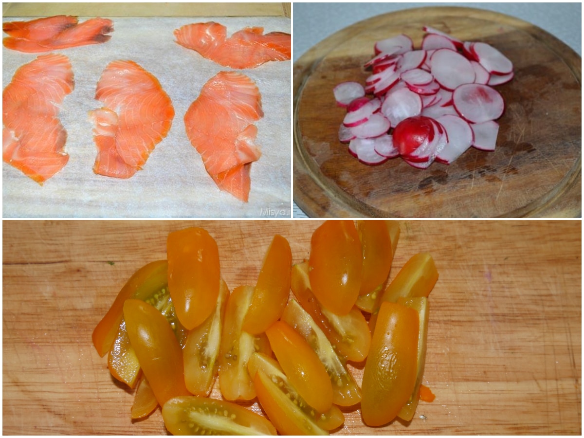 Lavate e affettate ravanelli e pomodorini e predisponete le fettine di salmone.