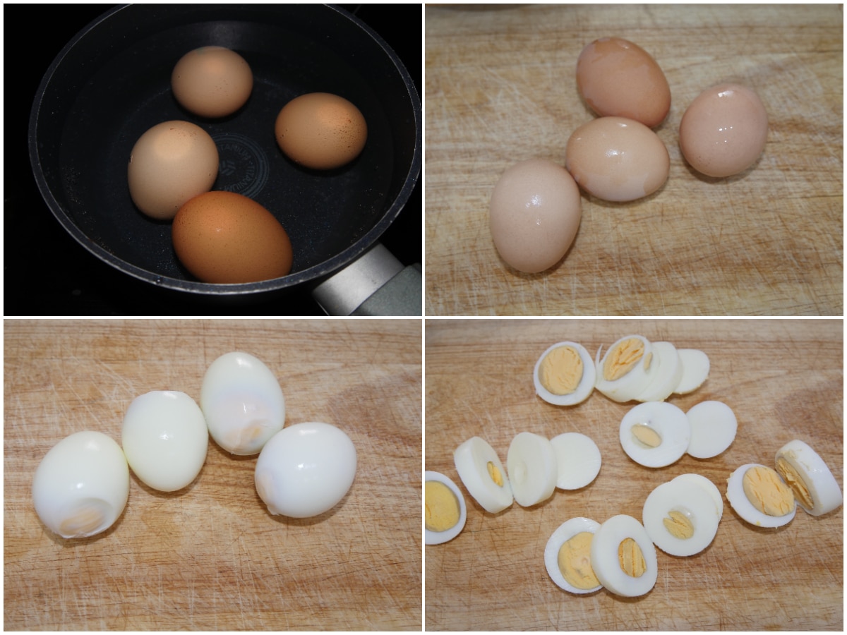 Innanzitutto mettete le uova in acqua fredda, portate a bollore e cuocete per 4-5 minuti dall'ebollizione, quindi sgusciatele e tagliatele a fettine.