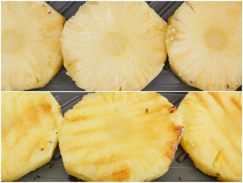 Fate scaldare una bistecchiera a fiamma alta, quindi grigliate l'ananas per un paio di minuti per lato, fino a fargli prendere le caratteristiche righine della griglia.