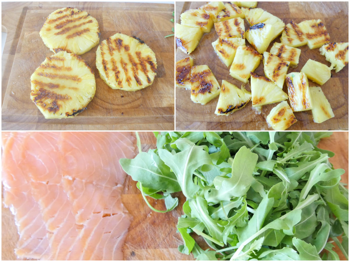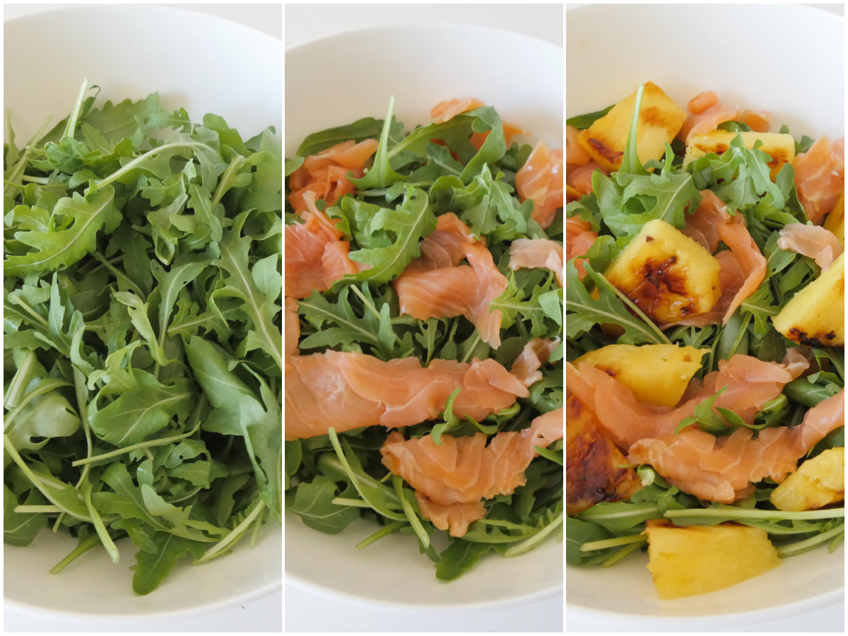 Unite in una ciotola: rucola lavata e spezzettata, salmone a straccetti e ananas, quindi condite ocn sale e olio a piacere e mescolate.