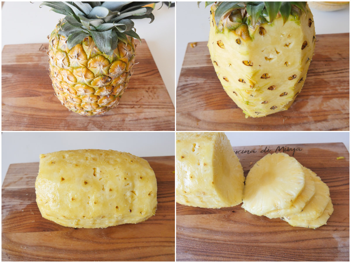 Innanzitutto pulite l'ananas (qui trovate la guida per farlo facilmente) e tagliatelo a fette di circa 1 cm.