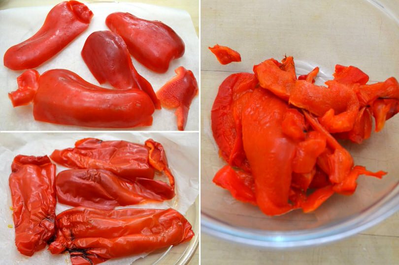 Pulite e cuocete i peperoni in micronde opzione grill per 5 minuti, spellateli, quindi tagliateli a filetti.