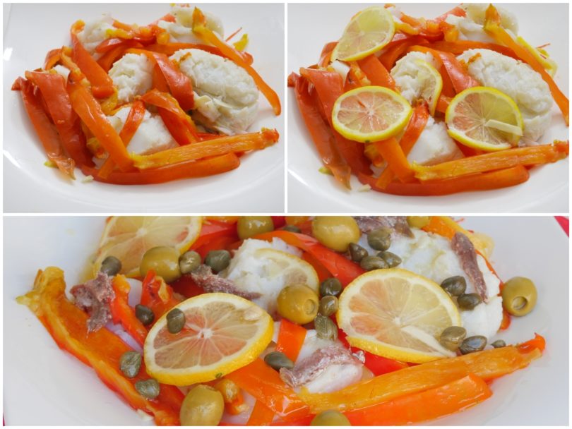 Mettete il pesce su un piatto da portata e conditelo con olio, succo di mezzo limone, poco sale, olive, capperi ben dissalati, aglio a fettine, peperoni e il restante limone tagliato a fettine.