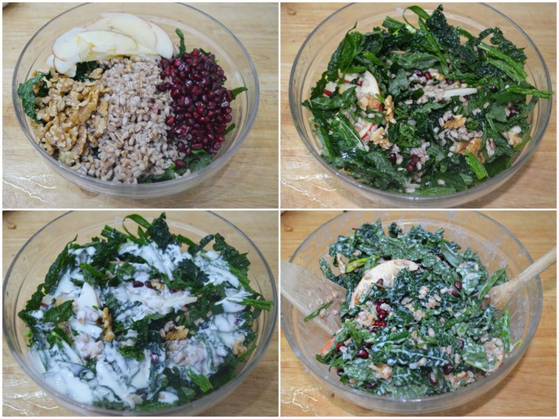 A questo punto assemblate l'insalata unendo in una ciotola il cavolo scolato, il farro, i gherigli di noce spezzettati grossolanamente, i chicchi di melograno.