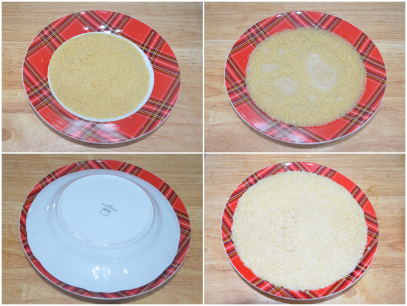 Innanzitutto preparate il cous cous: mettetelo in un piatto, aggiungete il doppio del peso in acqua calda, salate, mescolate, coprite con un altro piatto capovolto e lasciate che l'acqua venga assorbita (ci vorranno 5-10 minuti).