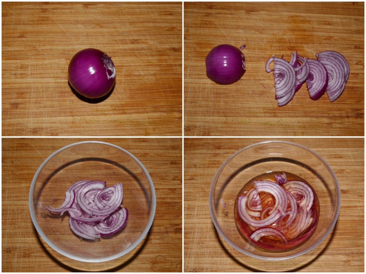 Ssbucciate e affettare la cipolla rossa, mettetela in una ciotola, e aggiungete l'aceto fino a ricoprirle. Coprire con pellicola trasparente e lasciate in infusione per 30 minuti.