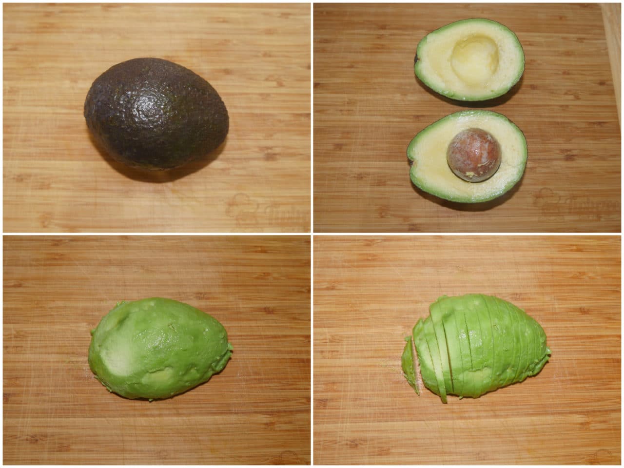 Sbucciare e rimuovete il nocciolo dall'avocado, quindi tagliare la polpa a fette lunghe, sottili.
