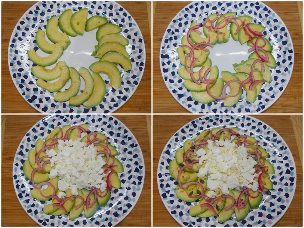 Andate a comporre l'insalata in due piatti separati. Mettendo un primo strato di avocado e ricoprendo con le cipolle, sollevate dall'aceto.