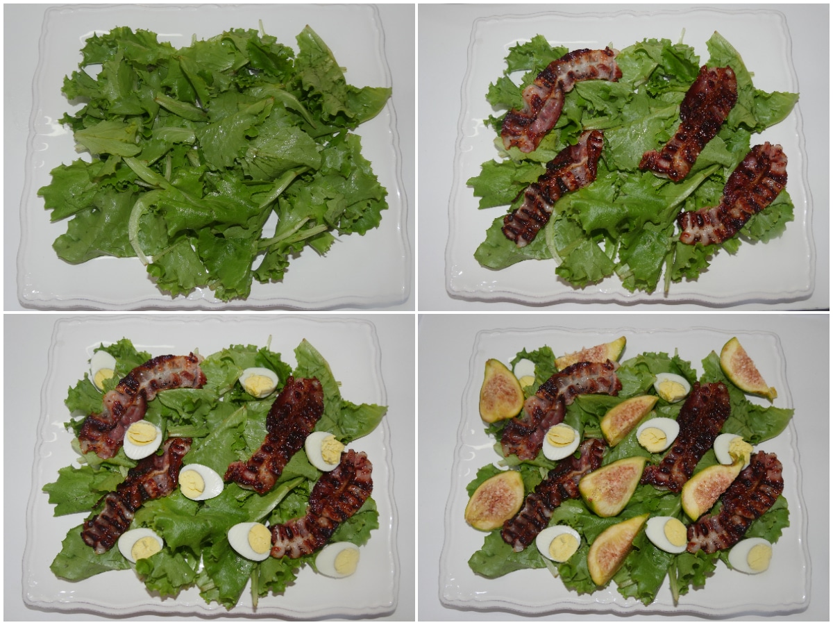 Disponete un letto di lattughino su di un piatto da portata, quindi aggiungete bacon, uova e fichi.