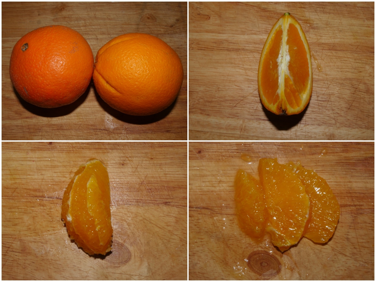 Nel frattempo pelate a vivo le arance, tagliatele a spicchi ed eliminate eventuali semini.