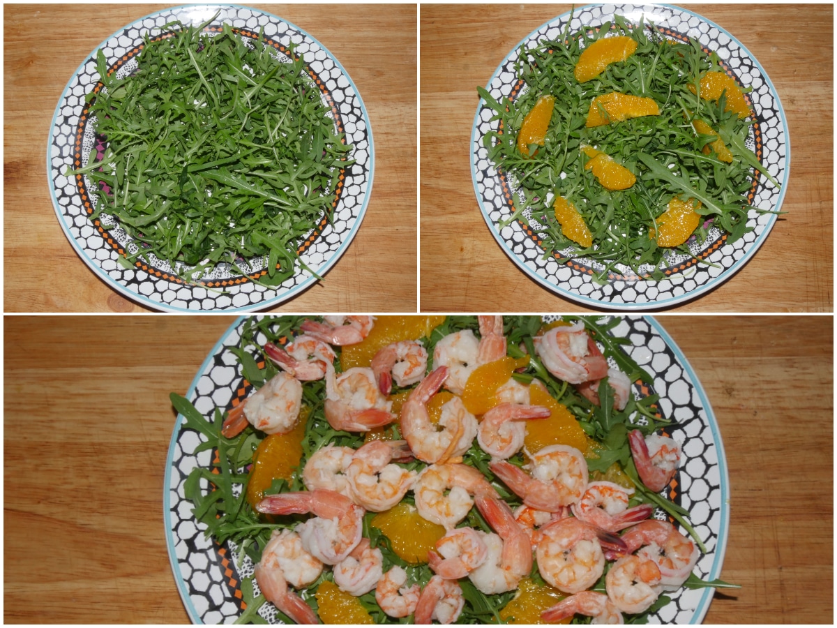 Componete il piatto: disponete sul piatto da portata la rucola, aggiungete l'arancia e poi i gamberi.