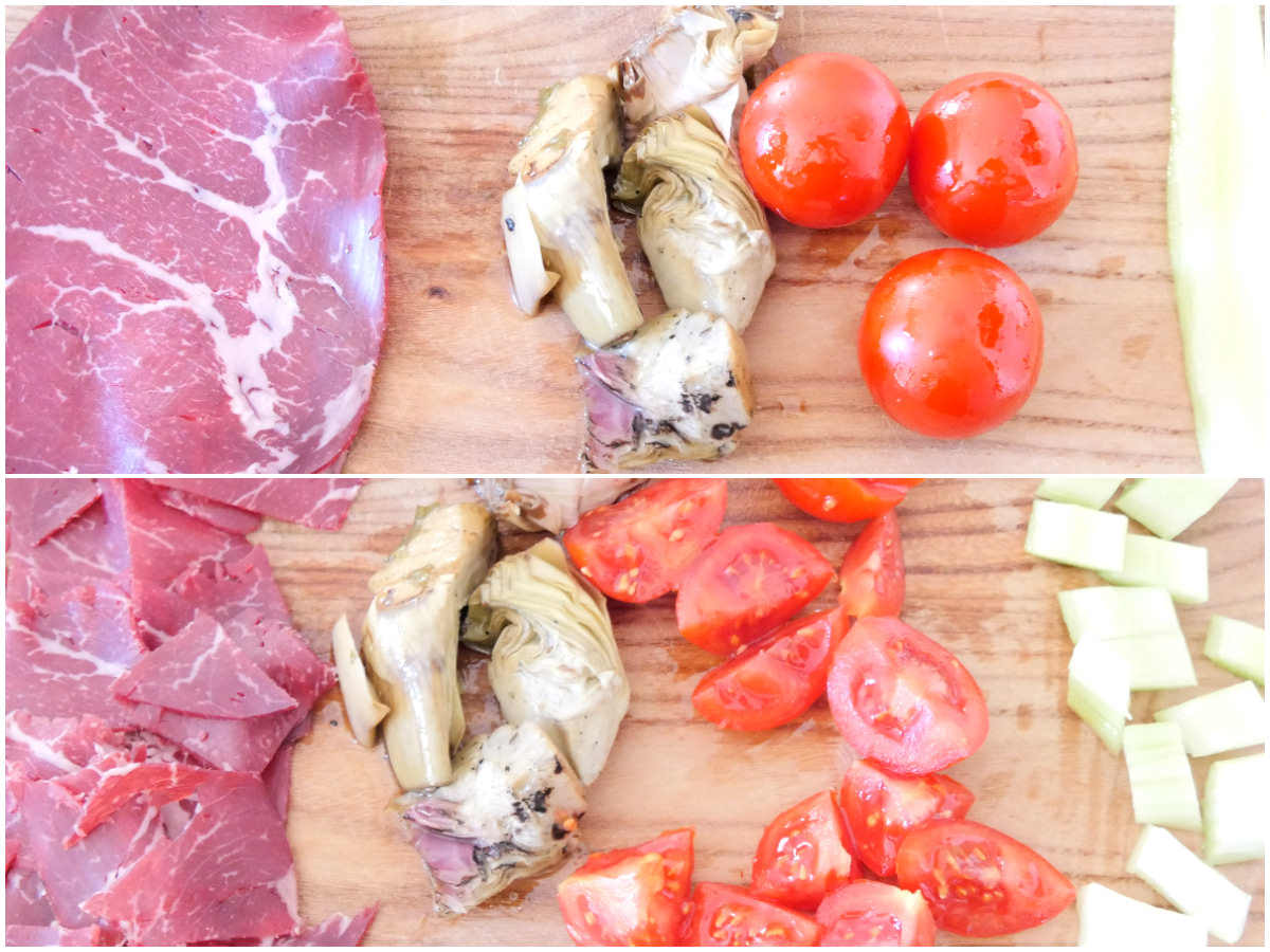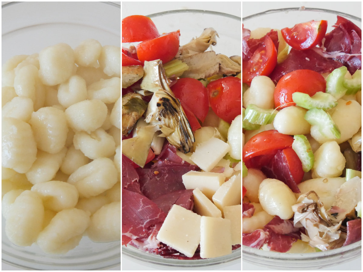 Nel frattempo che gli gnocchi si raffreddano, preparate gli altri ingredienti: lavate sedano e pomodorini e tagliate tutto a pezzetti (pomodorini, sedano, bresaola, carciofini, grana).