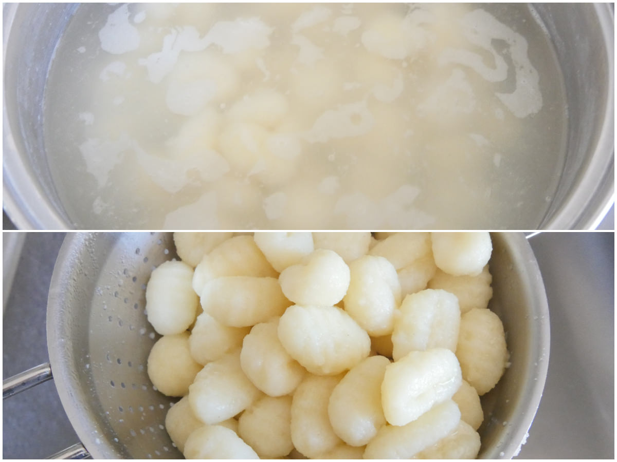 Innanzitutto lessate gli gnocchi in un'ampia pentola piena di acqua bollente salata, mescolate ogni tanto e scolateli quando salgono a galla, quindi passateli sotto acqua fredda (mentre sono ancora nello scolapasta) e conditeli subito con un filo d'olio.