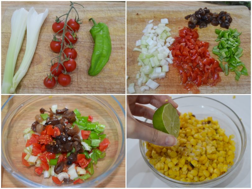 Condite il mais con il succo di lime e preparate tutti gli altri ingredienti, tagliandoli tutti a pezzetti dopo averli lavati.