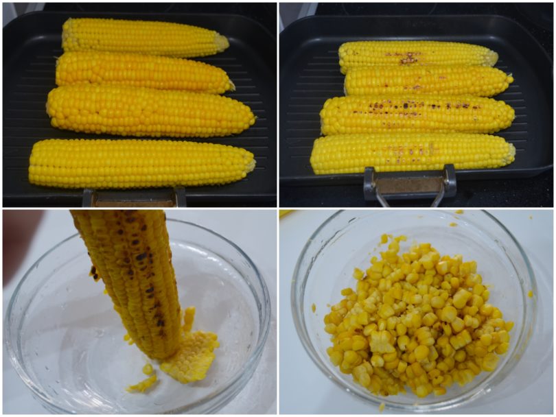 Scolate le pannocchie e fatele abbrustolire per qualche minuto su una bistecchiera ben calda, quindi sgranate i chicchi.