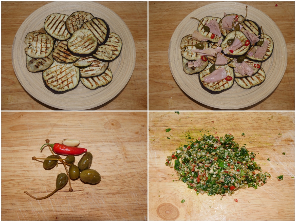 Posizionate le melanzane su di un piatto da portata e disponeteci sopra il tonno ben sgocciolato, metà dei capperi e metà del peperoncino (tagliato a fettine).