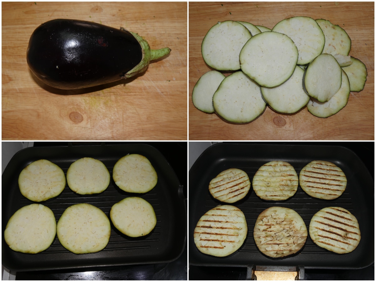 Innanzitutto lavate la melanzana, eliminate le estremità e tagliatela a fette (di largo, non di lungo) non troppo doppie, quindi grigliatele su una bistecchiera arroventata, facendole dorare da entrambi i lati (i tempi dipendono dal calore della superficie e dallo spessore delle fette).
