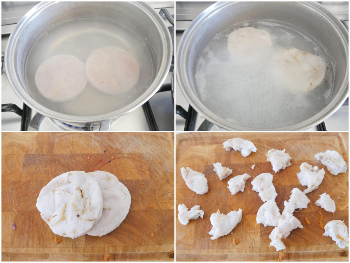 Innanzitutto cuocete il merluzzo in una pentola di acqua bollente per 10-15 minuti, quindi scolatelo, lasciatelo raffreddare e spezzettatelo.