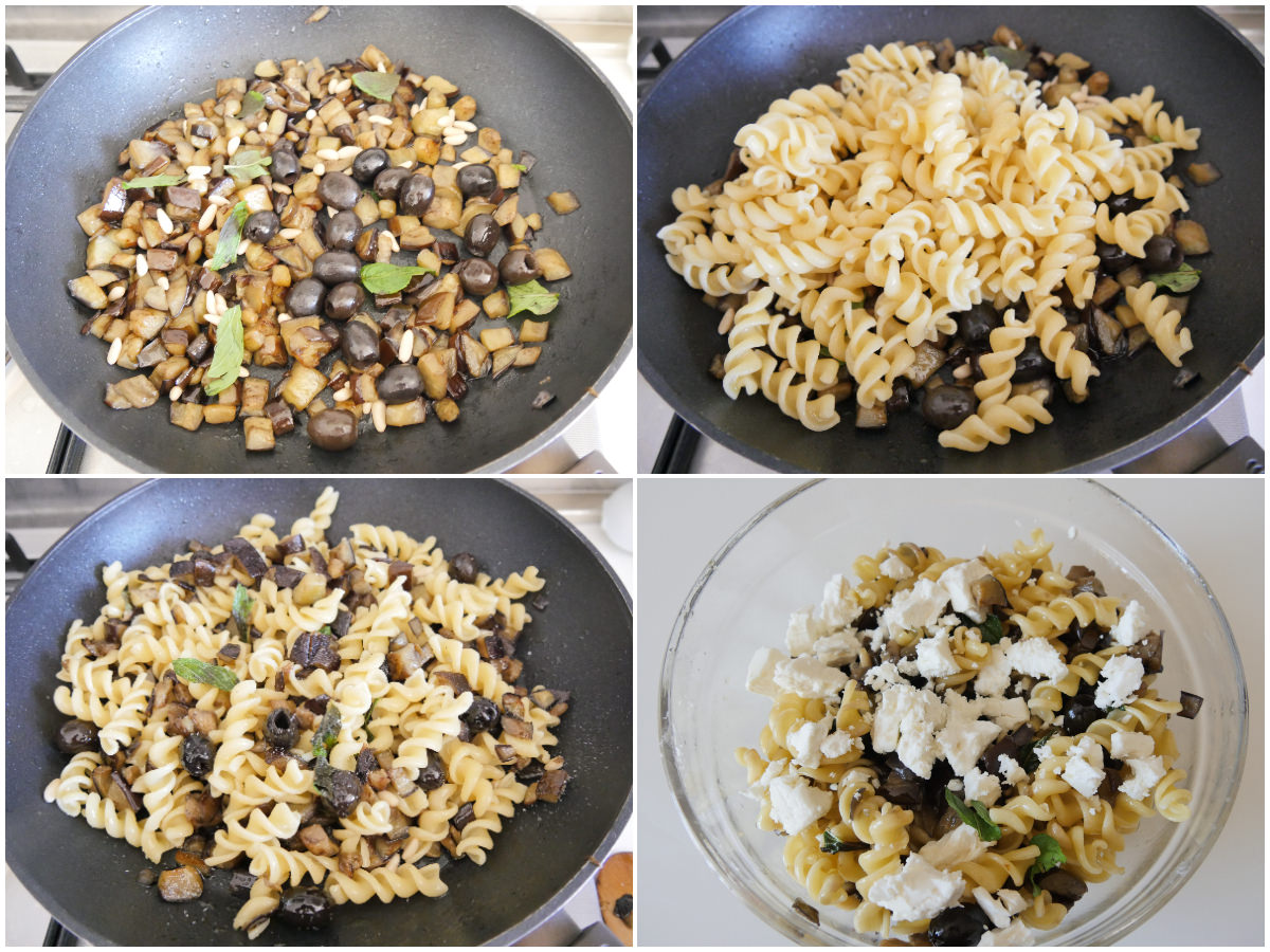 Aggiungete olive, pinoli e menta alle melanzane e fate insaporire rapidamente a fiamma viva, quindi aggiungete la pasta e mescolate.