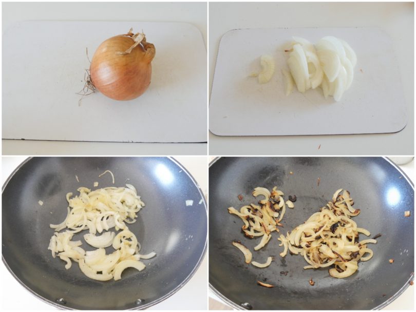 Innanzitutto pelate la cipolla, tagliatela a fettine sottili e fatela dorare in padella antiaderente con pochissimo olio, sale e pepe, quindi lasciatela raffreddare.