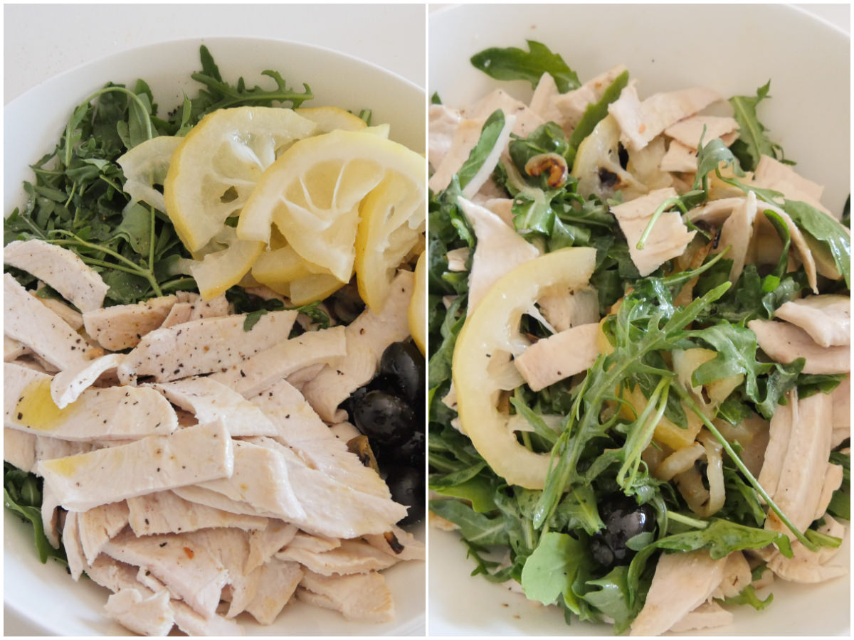 Quando tutti gli elementi saranno pronti, uniteli in una ciotola: pollo, limone, rucola e sedano ben lavati, olive denocciolate e cipolla.