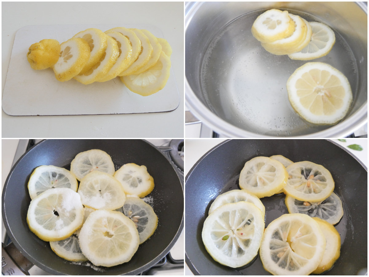 Nel frattempo lavate bene il limone, tagliatele a fette (di circa 1/2 cm), quindi sbollentate le fette per un paio di minuti , infine scolatele e ripassatele in padella con lo zuccherofino a farle leggermente caramellare.