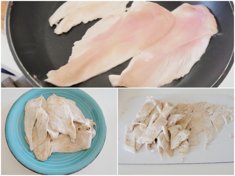A parte, arrostite il pollo in una padella antiaderente ben calda (potete usare anche una bistecchiera), cuocendolo bene da entrambi i lati (i tempi varieranno in base allo spessore delle fette: se sono molto sottili basteranno un paio di minuti per lato), quindi tagliatelo a listarelle e lasciate raffreddare anche questo.