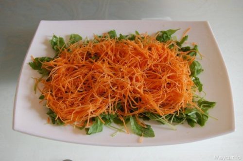 Tagliate le carote alla julienne e lavate la rucola quindi disporle su un piatto da portata.