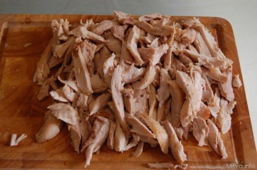 Una volta pronto, lasciar raffreddare il pollo quindi eliminare la pelle, staccate tutta la polpa, tagliatela a straccetti e salate.
