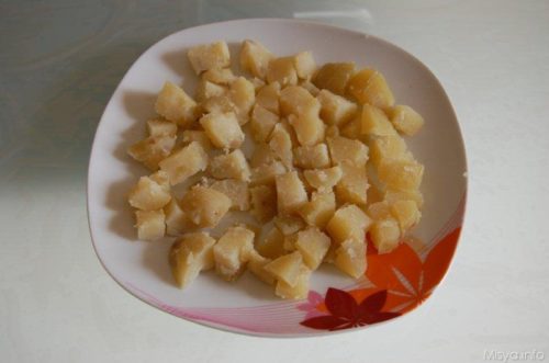 Lessate le patate, quindi sbucciatele ancora calde e tagliatele a dadini.
