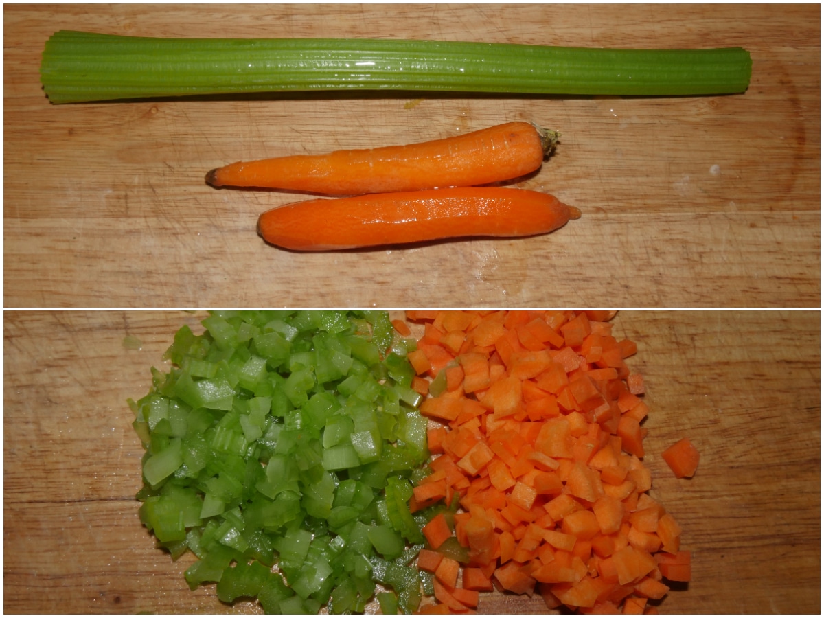 Mondate, lavate e tagliate a tocchettini sedano e carota.