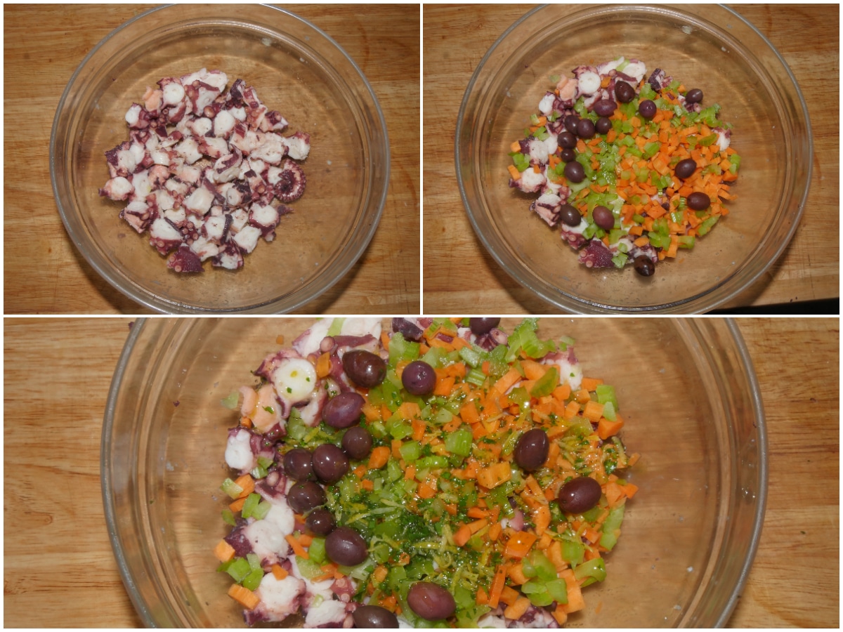 Unite in una ciotola polpo, sedano, carota, olive (meglio se denocciolate) e citronette e mescolate.